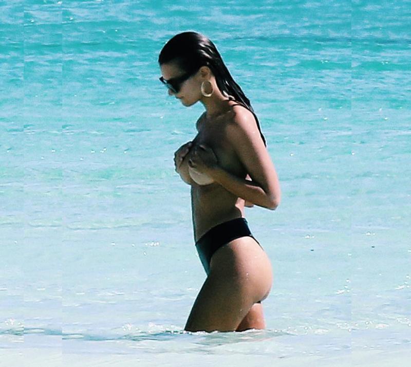 Emily Ratajkowski sale del mar sin su bikini