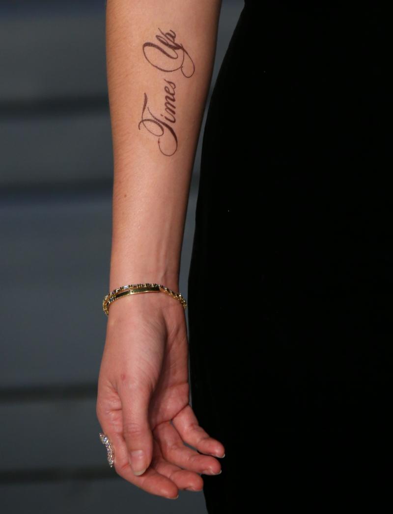 Vestida de negro y mostrando su antebrazo posó Emma, dando a conocer frente a los gráficos su nuevo tatuaje, que dice "Times Up".