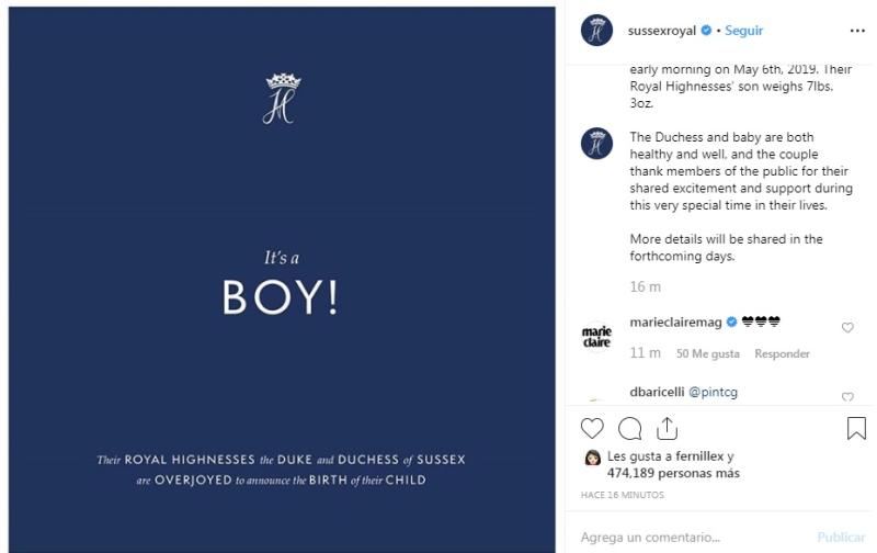 A poco de este comunicado, Harry y Meghan utilizan su cuenta oficial en Instagram para anunciar el nacimiento de su primer hijo... ¡y es un niño!