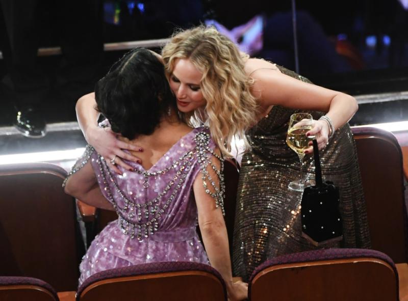 La actriz estadounidense Jennifer Lawrence protagonizó uno de los espectáculos más comentados de la noche en la ceremonia de los Premios Oscar, pero esta vez no lo hizo arriba del escenario del Teatro Dolby en Los Ángeles, sino que entre las butacas como una invitada más.