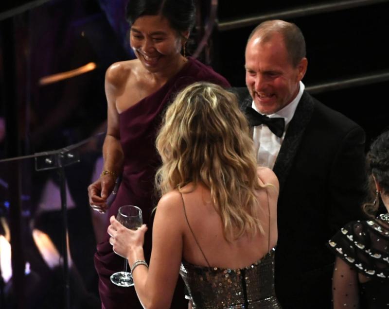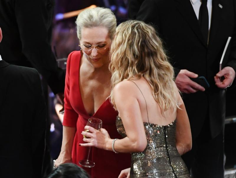 La protagonista de “Los juegos del hambre” se robó todas las miradas al caminar encima de los asientos con una copa de vino blanco en la mano. Además, la intérprete aprovecho de saludar a destacadas figuras de Hollywood como Meryl Streep, Salma Hayek y Woody Harrelson.