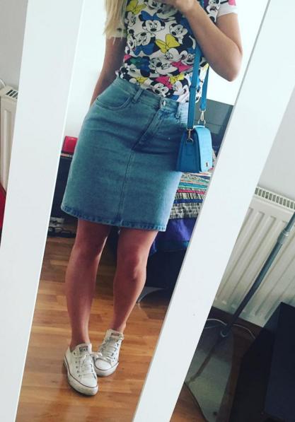 La falda tubo de mezclilla que ella la usa con poleras de algodón para el día y croptop escotado para otras ocasiones.