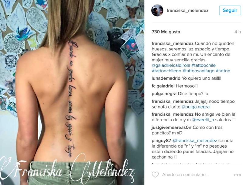 Sorpresa causó la decisión de Gala Caldirola de tatuarse la espalda, del cuello a la cola. Una frase recorre la zona por completo y dice: “cuando no queden huesos, seremos luz, espacio y tiempo”.