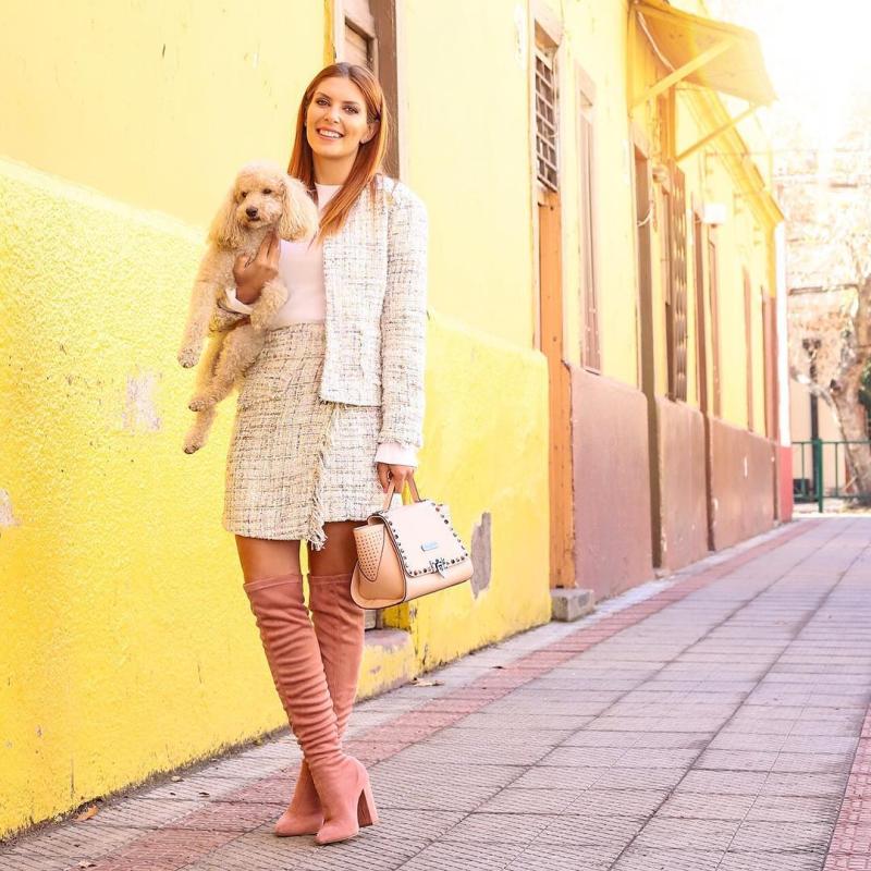 Euge luce una inspiración del clásico tweed de Chanel que destaca su feminidad y que acompañó con un bolso tradicional de mano y unas botas bucaneras en la gama del rosa.
