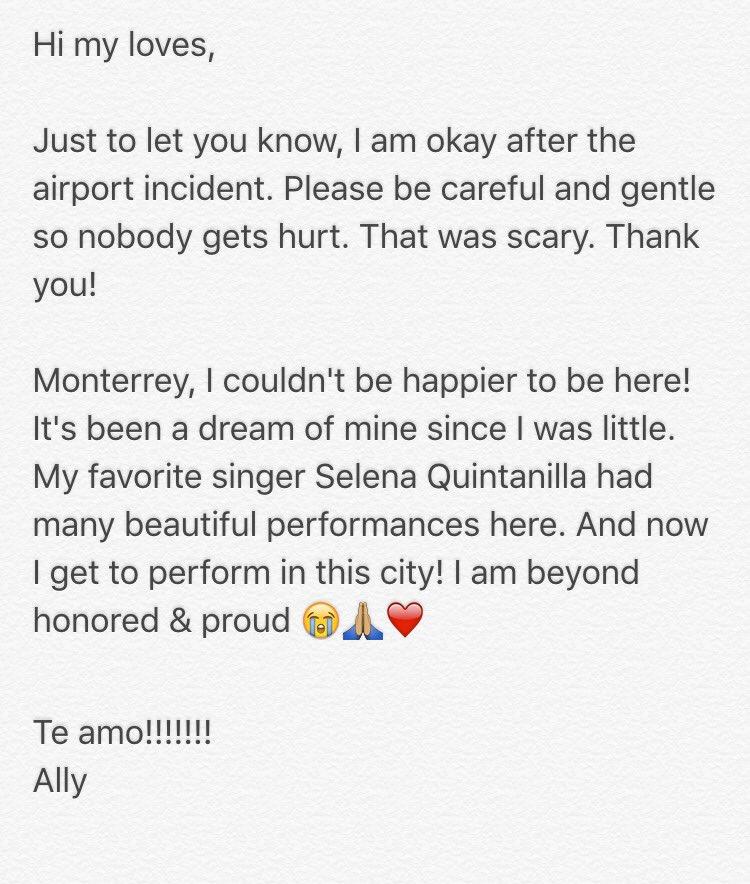 Ally se refirió al incidente a través de su cuenta oficial de Twitter, donde aseguró que “estoy bien después del incidente en el aeropuerto. Por favor, sean más cuidadosos y gentiles para que nadie resulte herido. Eso dio miedo”.
