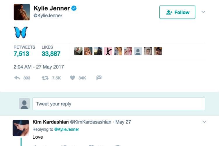 En tercer lugar, Kylie twitteó una mariposa en mayo de 2017. Kim le respondió “Love”.