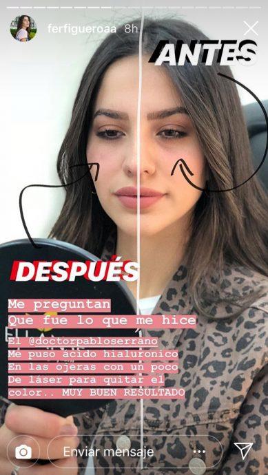 “El doctor Pablo Serrano me puso ácido hilaurónico en las ojeras con un poco de láser para quitar el color… muy buen resultado”, escribió en la instantánea donde muestra su antes y después.