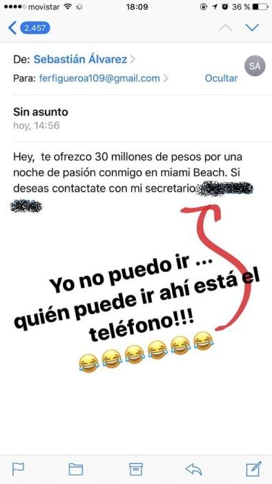 Fernanda Figueroa sorprendió en Instagram con un pantallazo de un correo que recibió de parte de un hombre que buscaba una noche de pasión con ella por la suma de 30 millones de pesos. Para concretar Fernanda debía comunicarse con la secretaria de la persona, cuyo número de contactó escribió sin pensar que sería funado por la modelo.