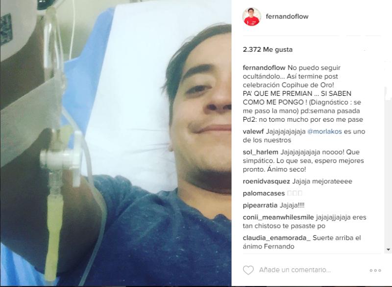 Con una foto desde la cama de urgencia y con suero a la vena, Fernando explicó que como en general no toma mucho, el alcohol le hizo mal.
