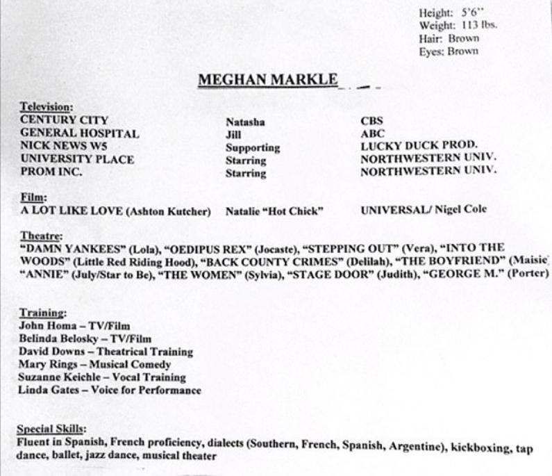 Según confirma el medio The Daily Mail, el resumen que utilizó la mujer del Príncipe Harry al comienzo de su carrera como actriz enumera sus papeles de televisión en las series "Hospital General" de ABC en 2001 y "Century City" de CBS en 2004, además de su rol como Natalie en la película "A Lot Like Love" en el 2005, en la que compartió escena junto al famoso actor Ashton Kutcher.