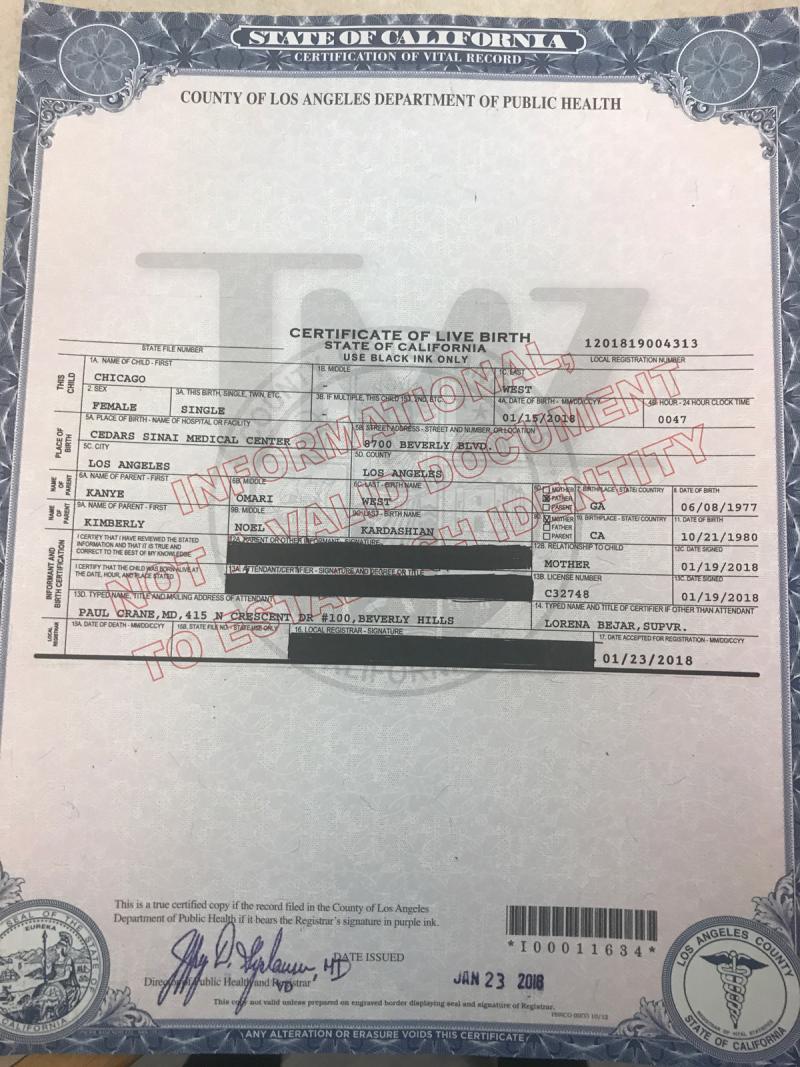 Pero hace algunos minutos el sitio TMZ filtró el certificado de nacimiento de Chicago y en él se revelan algunos detalles. Por ejemplo que nació el 15 de enero pasado a las 12:47 AM y que pesó 7 libras y 6 onzas (algo así como 3,5 kilos).