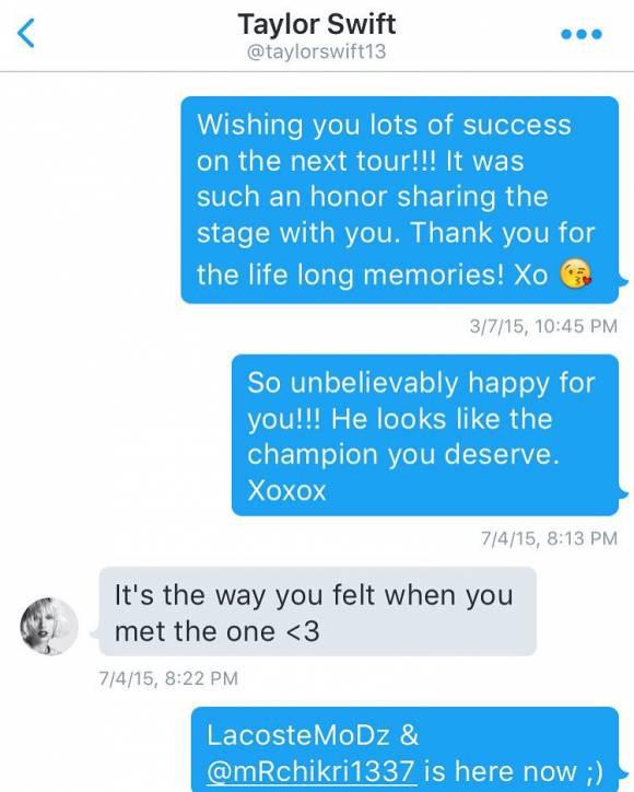 En medio del quiebre entre Taylor Swift y el DJ es que aparecieron unos mensajes que la artista se mandó con uno de sus bailarines. Perez Hilton difundió los pantallazos argumentando que las cuentas de Scott Myrick y Mallauri Esquibe fueron intervenidas por un usuario que les dio a conocer las conversaciones.