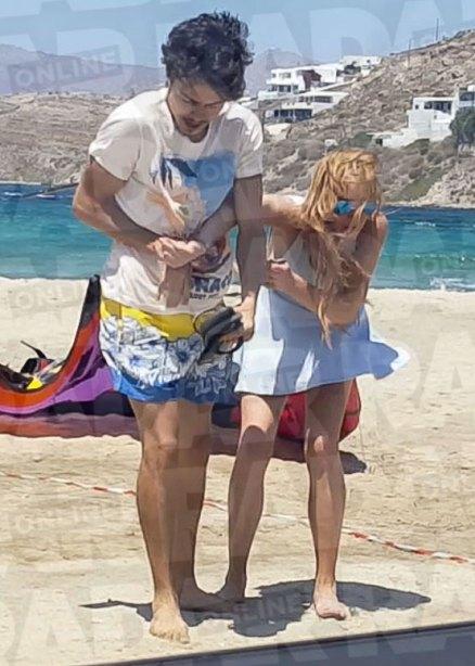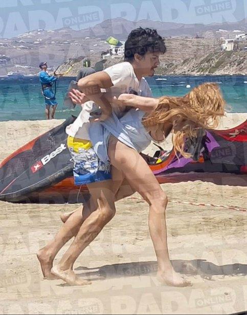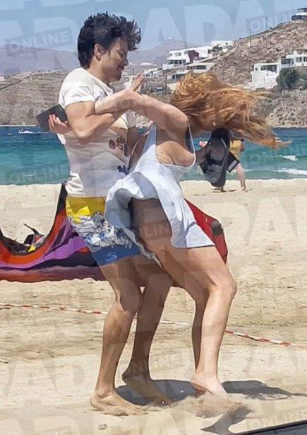 La actriz lanza un celular desde un auto hacia la playa, ambos se bajan para buscarlo desesperadamente y él la agarra por el brazo para quitarle el aparato móvil.