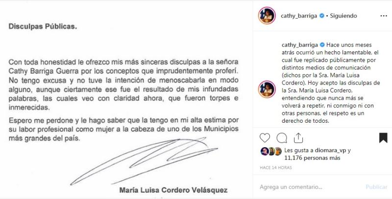 "Hace unos meses atrás ocurrió un hecho lamentable, el cual fue replicado públicamente por distintos medios de comunicación (dichos por la Sra. María Luisa Cordero). Hoy acepto las disculpas de la Sra. María Luisa Cordero, entendiendo que nunca más se volverá a repetir, ni conmigo ni con otras personas, el respeto es un derecho de todos", manifestó Barriga.