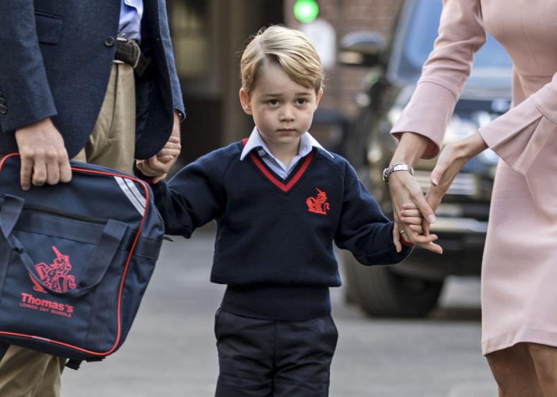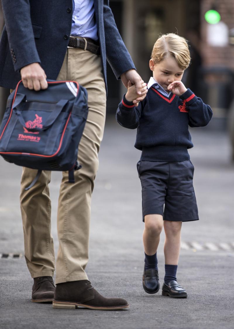 El príncipe George de Ignlaterra vivió su primer día de clases esta jornada y fue recibido en la escuela privada Saint Thomas, en el barrio de Londres Battersea, de la mano de su padre.