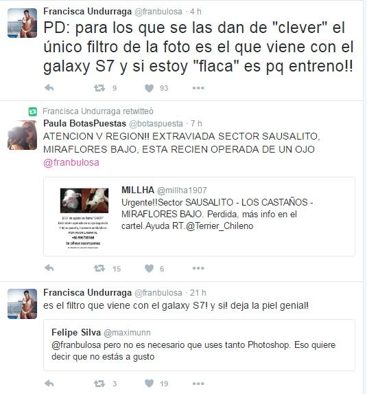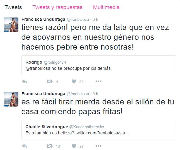 Esta publicación no pasó inadvertida para Undurraga y le contestó varias veces excusándose de que era un filtro, después que sí estaba delgada y destacó el poco apoyo que existe entre el género.
