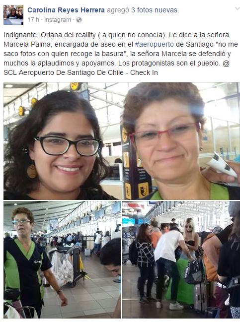 Pero Carolina Reyes Herrera, quien estuvo ese día en el aeropuerto, asegura que Marzoli habría discriminado a una de estas seguidoras por trabajar en el aseo del aeropuerto. En Facebook, publicó algunas fotos y un texto, en el que asegura que la respuesta de la rubia a la petición de Marcela Palma fue “no me saco fotos con quien recoge la basura”.