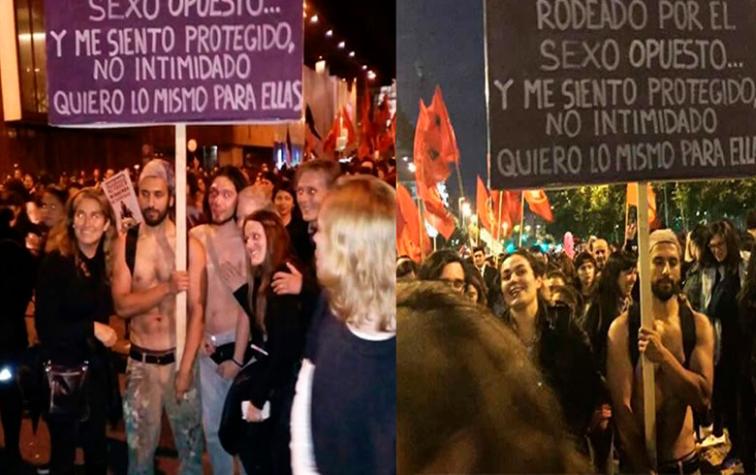 Fue una de las imágenes más alabadas de la marcha #Niunamenos. Un joven sin polera portando el cartel con el siguiente mensaje ““Estoy semidesnudo, rodeado por el sexo opuesto. Y me siento protegido, no intimidado. Quiero lo mismo para ellas”.