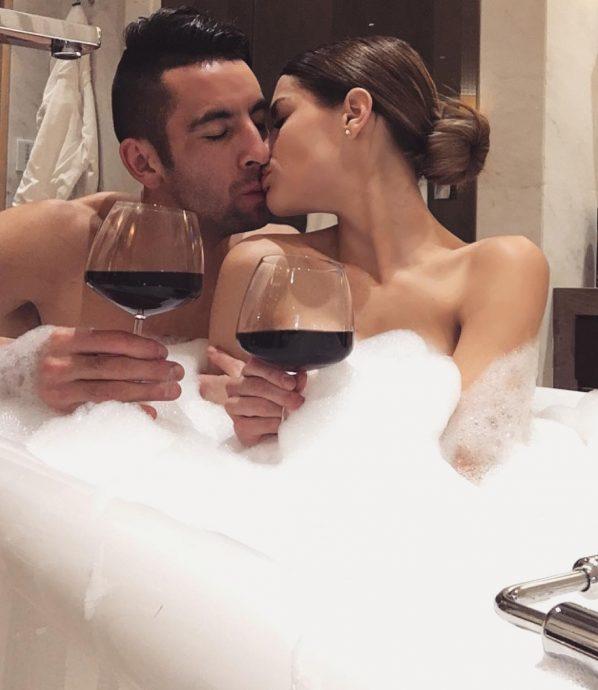 Se trata de una postal donde aparece desnuda junto a Mauricio Isla dentro de un jacuzzi sosteniendo unas copas de vino.