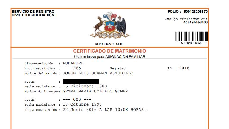 El certificado de matrimonio del registro Civil revela Jorge Luis Guzmán Astudillo y Gemma María Collado Gómez sellaron su unión el 22 de junio a las 10 de la mañana en la comuna de Pudahuel.
