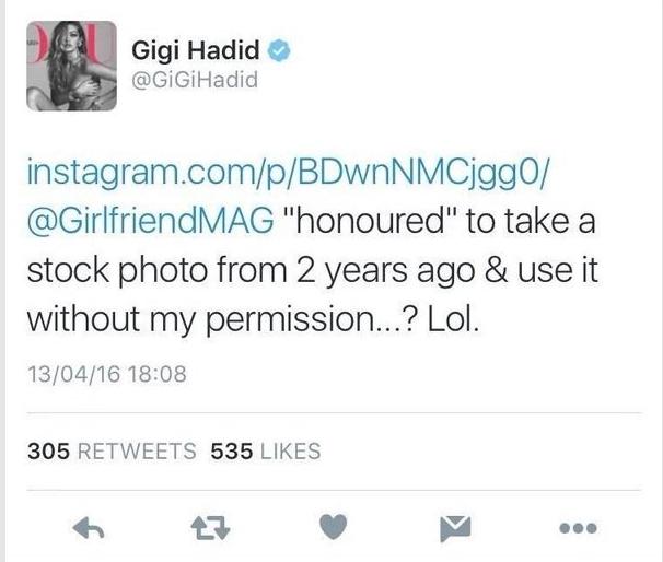 Molesta está Gigi Hadid con la revista “Girlfriend” que en su portada la muestra muy sonriente, pero con varios años menos. Así lo denuncia en rede sociales la maniquí: “¿‘Honrados’ de tomar una foto de hace dos años atrás y usarla sin mi permiso? ¡Lol!”, escribió en Twitter en respuesta a un mensaje que la publicación tiene en su cuenta de Instagram.
