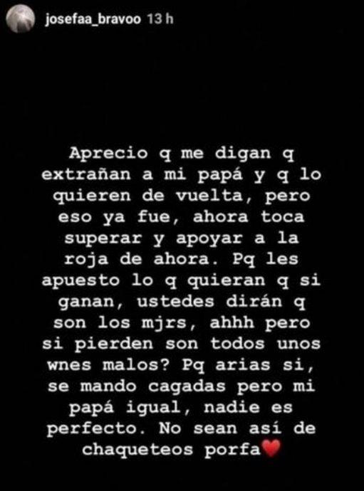 “Aprecio que me digan que extrañan a mi papá y que lo quieren de vuelta, pero eso ya fue. Ahora toca superar y apoyar a la roja de ahora. Porque les apuesto lo que quieran que si ganan, ustedes dirán que son los mejores, ahhh pero si pierden son todos unos wnes malos? Porque Arias sí, se mandó cagadas, pero mi papá igual, nadie es perfecto. No sean así de chaqueteros porfa”, escribió la menor.