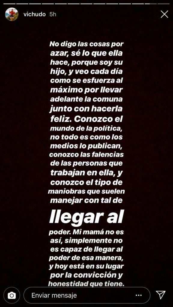 "No digo las cosas por azar, sé lo que ella hace porque soy su hijo, y veo cada día como se esfuerza al máximo por llevar adelante la comuna junto con hacerla feliz", son parte de sus palabras.