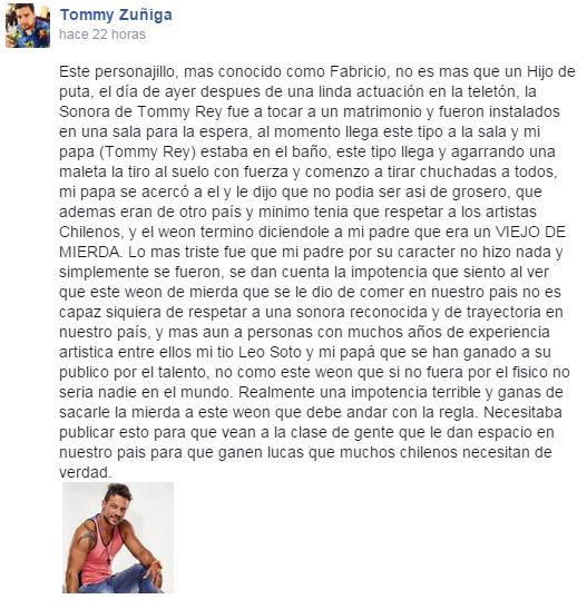 De acuerdo a Zuñiga, Fabricio atacó verbalmente a su padre durante el evento privado, donde compartieron el mismo camarín. "Este tipo llega y agarrando una maleta la tiro al suelo con fuerza y comenzo a tirar chuchadas a todos, mi papa se acercó a el y le dijo que no podia ser asi de grosero, que ademas eran de otro país y minimo tenia que respetar a los artistas Chilenos, y el weon termino diciendole a mi padre que era un VIEJO DE MIERDA", escribió Tommy Zuñiga en Facebook.