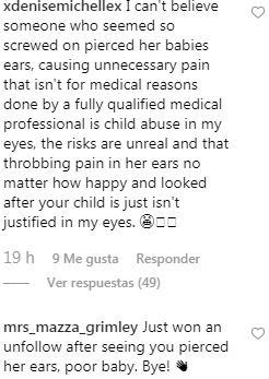 "Esto es abuso infantil en mis ojos, los riesgos son irreales y ese dolor palpitante en sus orejas, no importa cuán feliz y cómo se ve tu hija después. Simplemente no se justifica para mí", "Acabas de perder un seguidor después de verte perforar sus orejas, pobre bebé, adiós", "No puedo entender por qué tu pensarías que está bien perforar las orejas de tu hija", fueron algunos de mensajes que recibió en la publicación.