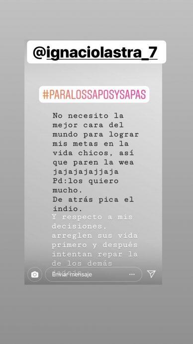 “No necesito la mejor cara del mundo para lograr mis metas en la vida, chicos, así que paren la weá jajajaja. PD: los quiero mucho. De atrás pica el indio. Y respecto a mis decisiones, arreglen sus vidas primero y después intenten reparar la de los demás”, fue su mensaje.