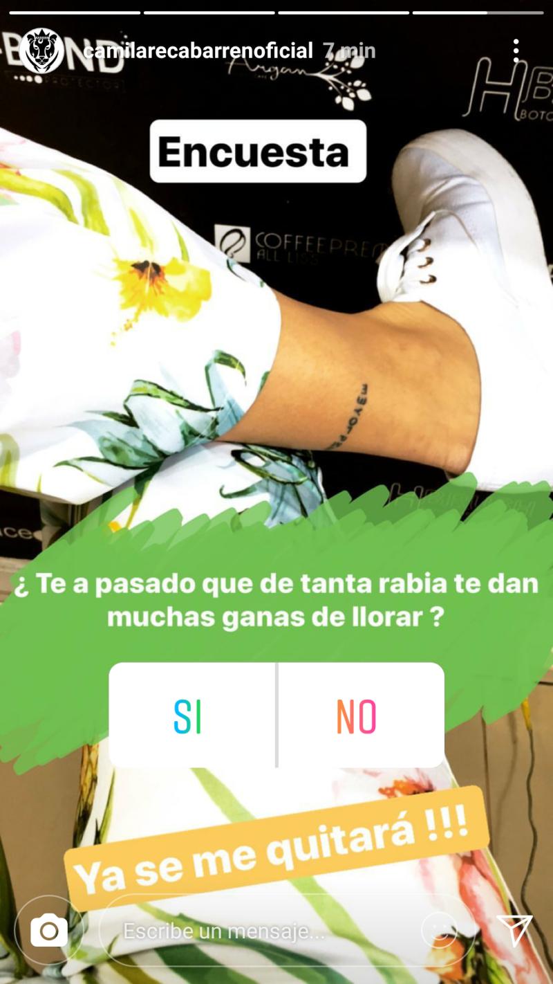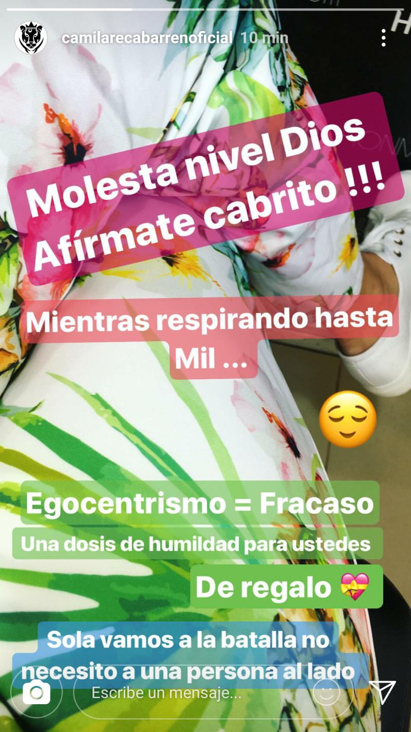 Por su parte Camila Recabarren le respondió a través de las stories de Instagram. “Molesta nivel Dios, afírmate cabrito”, “Egocentrismo =fracaso”, “Una dosis de humildad para ustedes, de regalo”, fueron algunas de las frases que escribió en la red social.