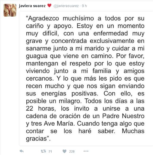 Un rumor aseguraba estos días que Suárez además está embarazada de pocas semanas, situación que la llevó a confirmar la situación y escribir redes sociales: