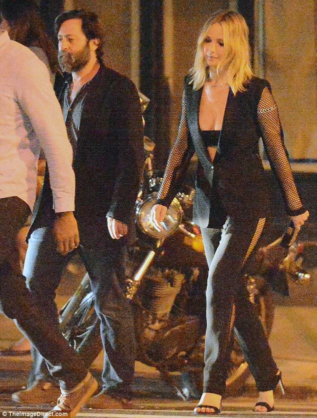 Paseando por Nueva York la pareja fue fotografiada y Lawrence se roba estas imágenes vistiendo un traje negro de dos piezas con tela de rejilla en mangas y costados del pantalón.