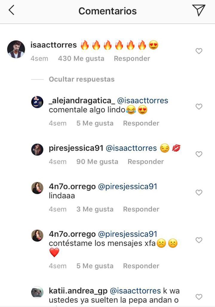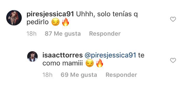 La francesa no se queda atrás y ante el encabezado de una foto de Isaac que decía "porque esta noches es de nosotros dos, vamos a prenderle fuego a todo", Pires respondió "Uhhh, solo tenías que pedirlo" junto a un emoji coqueto y otro de fuego. Por su parte, el español escribió "Te como mami" y los mismos iconos.