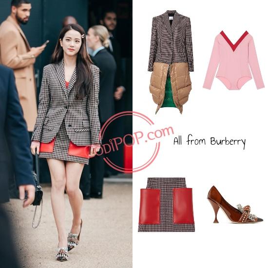 Y por su lado, mucho más clásica y de total Burberry se luce Jisoo: