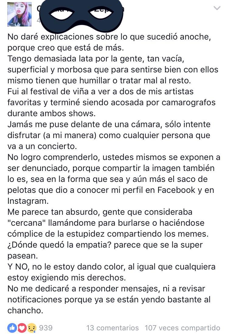 Radio Cooperativa subió una captura de pantalla del mensaje que la joven envió en Facebook, tapando su nombre, pero en el que se puede ver el texto. “Tengo demasiada lata por la gente, tan vacía, superficial y morbosa que para sentirse bien con ellos mismos tienen que humillar o tratar mal al resto”, comienza.