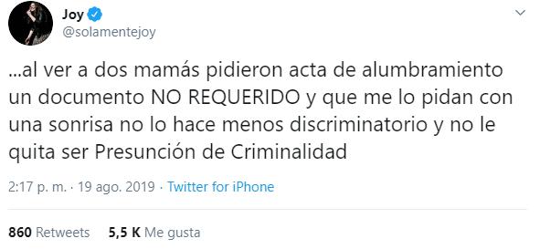 “Al ver dos mamás pidieron acta de alumbramiento, un documento NO REQUERIDO y que me lo pidan con una sonrisa no lo hace menos discriminatorio y no le quita ser Presunción de Criminalidad”