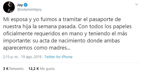 “Mi esposa y yo fuimos a tramitar el pasaporte de nuestra hija la semana pasada. Con todos los papeles oficialmente requeridos en mano y teniendo el más importante: su acta de nacimiento donde ambas aparecemos como madres…”