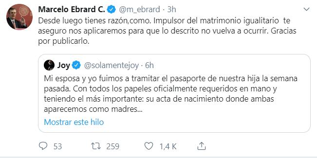 "Desde luego tienes razón. Como impulsor del matrimonio igualitario te aseguro nos aplicaremos para que lo descrito no vuelva a ocurrir. Gracias por publicarlo", replicó el secretario de Relaciones Exteriores de México, Marcelo Ebrard.