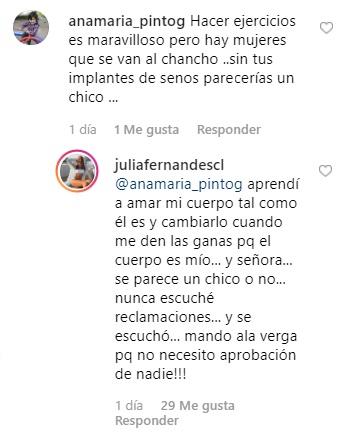 Una usuaria le escribió que si no fuera por sus implamentes Julia parecería un "chico" a lo que la joven respondió molesta.