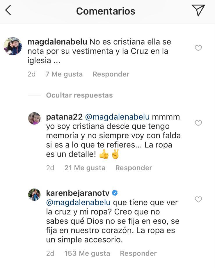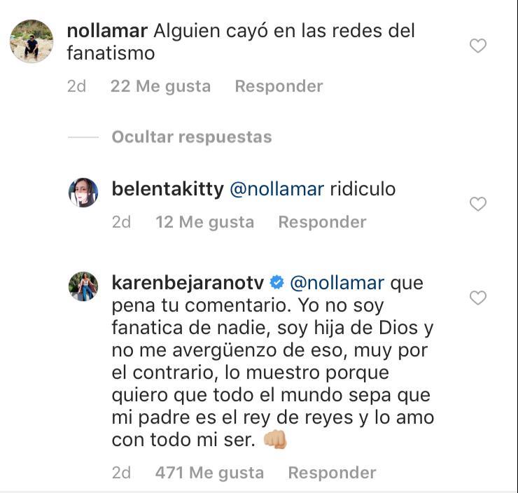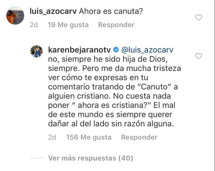 “¿Ahora es canuta?”, escribió un seguidor, a lo que la cantante respondió: "No, siempre he sido hija de Dios, siempre. Pero me da mucha tristeza ver cómo te expresas en tu comentario tratando de “Canuto” a alguien cristiano. No cuesta nada poner “¿ahora es cristiana?” El mal de este mundo es siempre querer dañar al del lado sin razón alguna".