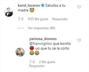 La rubia subió una imagen de su figura luciendo sus curvas y agradeciendo la herencia de su madre, a lo que Karol respondió: "saludos a tu madre", ocasionando críticas de usuarias.