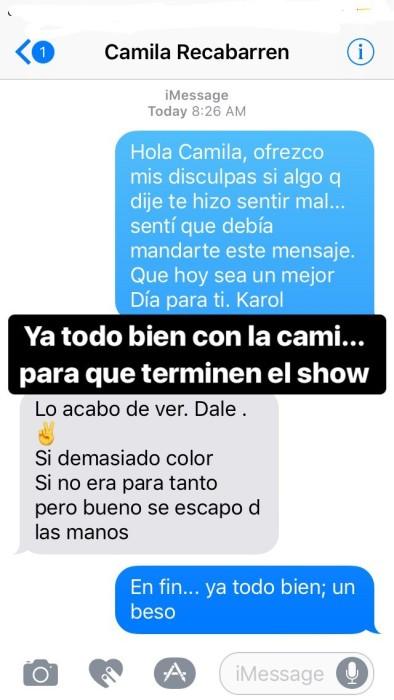 “Hola Camila. Ofrezco mis disculpas si algo que dije te hizo sentir mal… Sentí que debía mandarte este mensaje. Que hoy sea un mejor día para ti. Karol”, escribió el también locutor radial, según él mismo reveló en sus historias de Instagram.