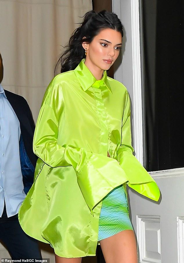 Marni Senofonte es la stylist detrás del look de Kendall, quien vistió una mini falda ajustada y encima una blusa flúor conarquitectura. Tacones traslucidos y con brillantes hicieron lucir todavía más alta y estilizada a la joven.