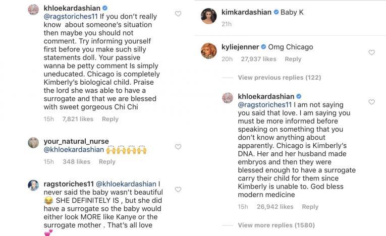 Khloé Kardashian no lo pensó dos veces antes de defender a su hermana luego de que un tras un usuario asegurara que Chicago no era hija biológica de Kim Kardashian ya que llegó a este mundo a través de un embarazo subrogado.