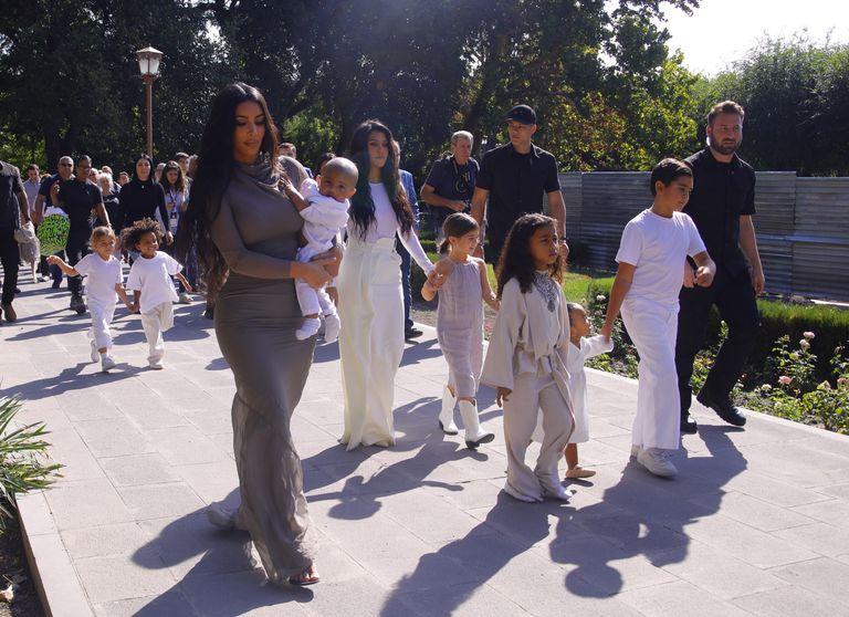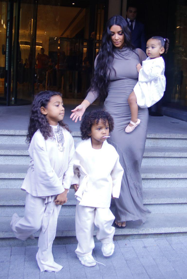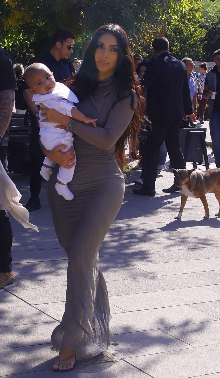 North, su hija mayor, fue bautizada en 2015 en Jerusalén, por lo que ahora sólo Psalm, de 4 meses, Chicago, de un año y medio y Saint, de 3 años y medio, fueron los protagonistas de la ceremonia que se realizó en la catedral de Ejmiatsin, en Armenia.