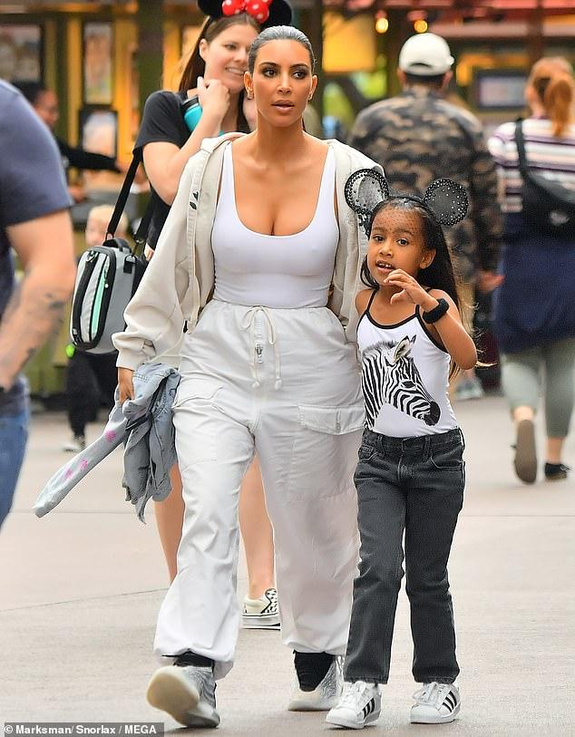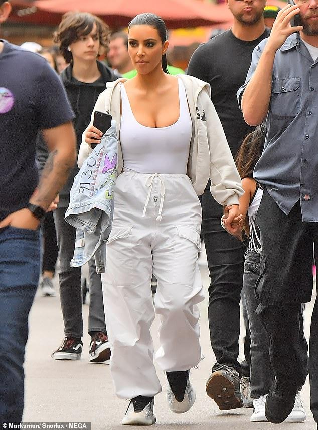 La celebridad tuvo que ir a Dinseyland porque North West tenía una celebración con sus amistades, así que no lo pensó dos veces y optó por un outfit de buzo blanco y zapatillas.