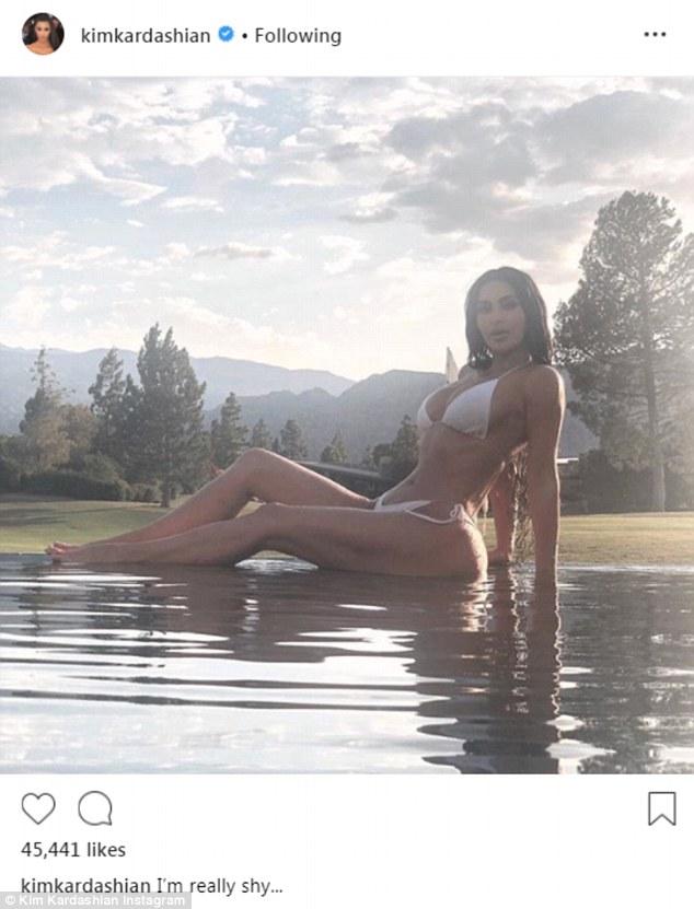 "Soy realmente tímida", expresa Kim a la hora de publicar una de sus instantáneas, en bikini presumiendo de sus curvas en una piscina...¿nos estará tomando el pelo?