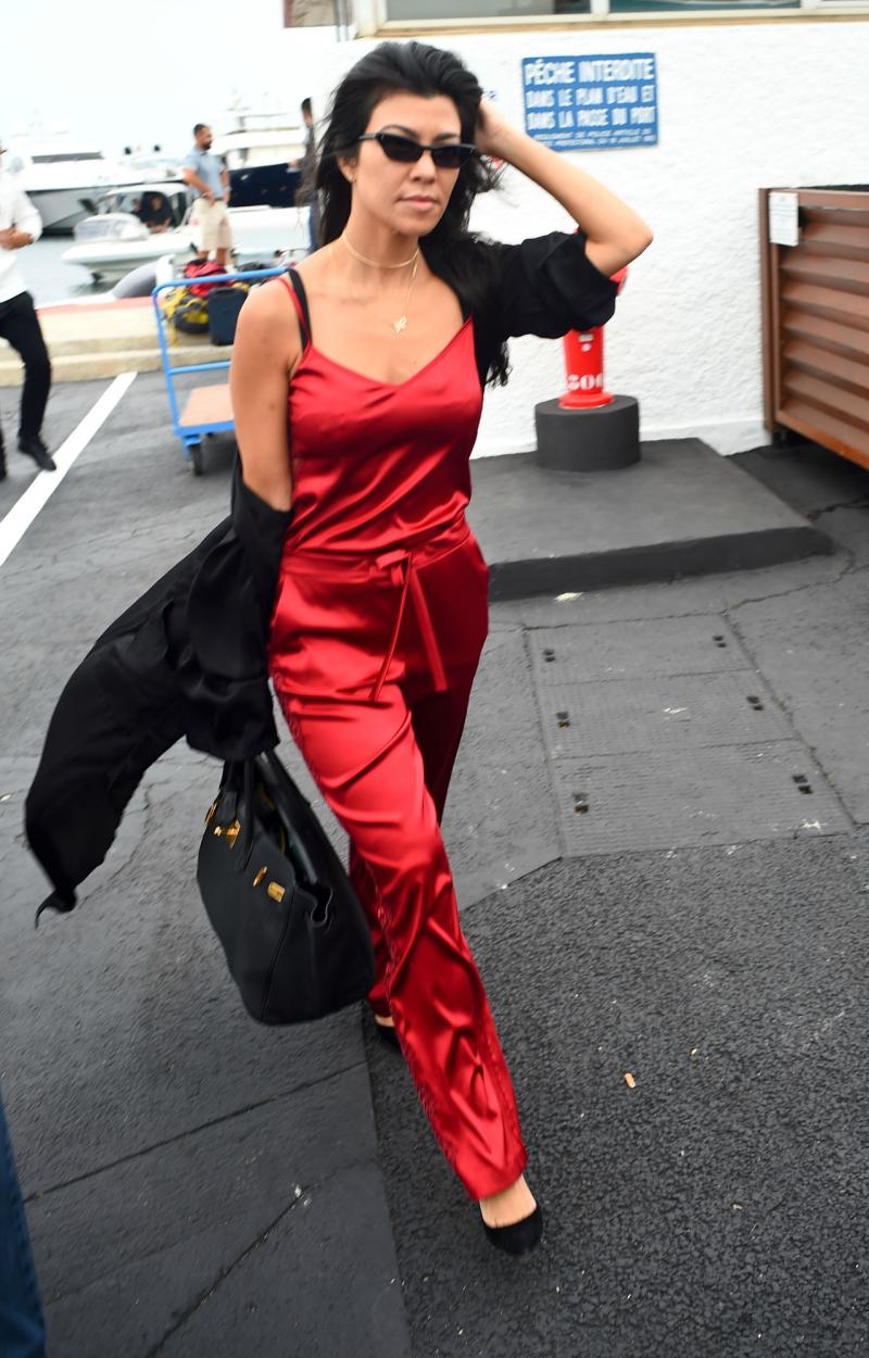 Kourtney se fue vestida como para una gala, con un enterito rojo de satín.
