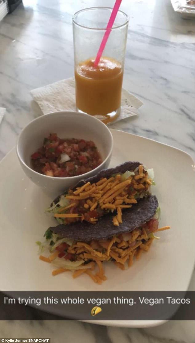 Kylie Jenner se decidió y dejó la carne. Lo que más lamenta la celebridad es no consumir pollo, uno de sus favoritos. Para empezar la hermana de Kendall optó por unos tacos con verduras y queso, los que dio a conocer en Snapchat para contar con los comentarios de sus admiradores.